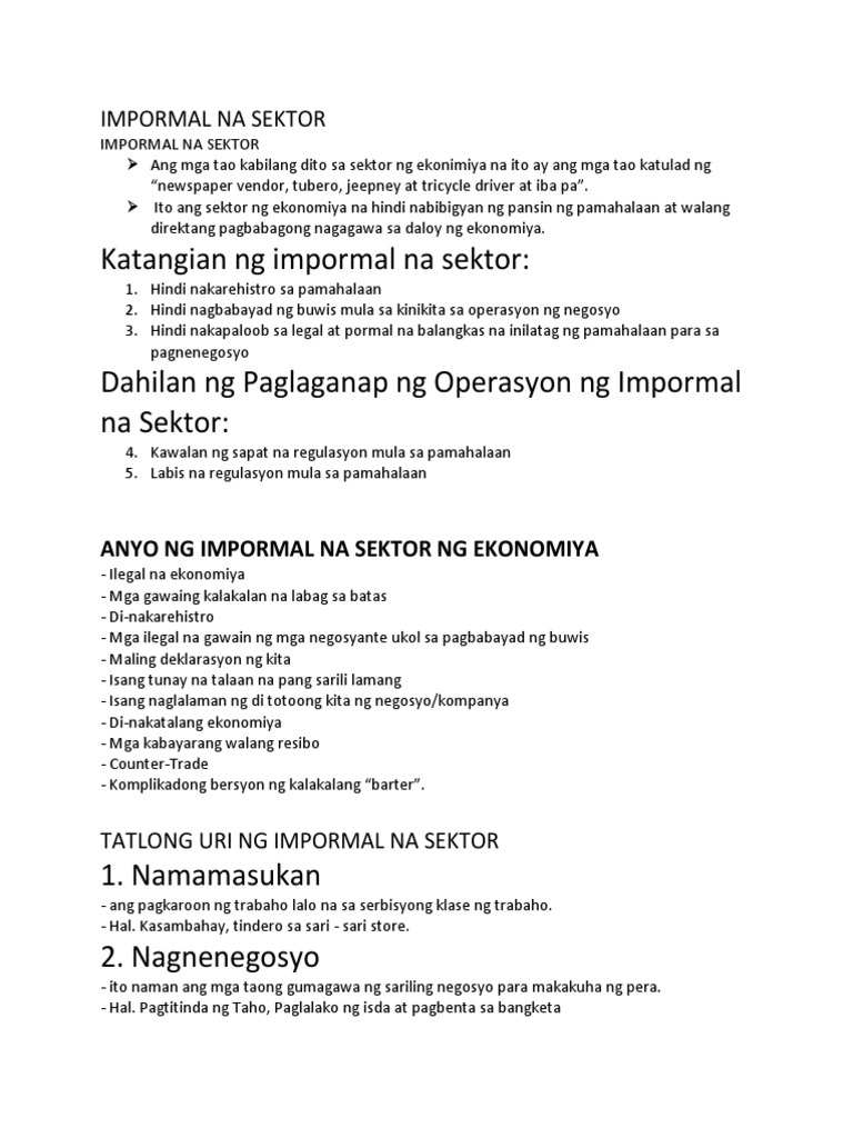 Ang karaniwang katangian ng impormal na sektor ay hindi nakarehistro hindi nagbabayad ng buwis at hindi nakapaloob sa legal at pormal na balangkas ng pamahalaan. Up to 3 cash back ANG HALIMBAWA NG IMPORMAL NA SEKTOR AY TEACHER ENGINEER AT NURSE. Uri ng pamumuhay na kabilang sa mga bansang papaunlad pa lamang ayon sa Economic development model ni W.